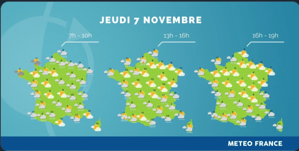 La perturbation arrivée mercredi par la façade Ouest s’étendra aux régions du nord, pouvant atteindre l’Auvergne-Rhône-Alpes et les Midi-Pyrénées. Elle se déplacera vers les frontières de l’Est puis quittera le territoire en fin de journée. L’instabilité sera marquée sur les côtes de la Manche et sur un bon quart sud-ouest du pays où des orages seront même probables. En fin d’après-midi et soirée, les éclaircies se feront plus larges dans l’intérieur du pays, propices à la formation de plaques de nuages et de brouillards. En Corse, des orages sont à prévoir. Le vent sur la moitié ouest du pays pourra atteindre 60 à 70 km/h, voire 80 à 90 sur la côte aquitaine. Les maximales peineront à atteindre 8 à 12 degrés, 15 à 17 sur les rivages de la Méditerranée, 19 à 20 en Corse.